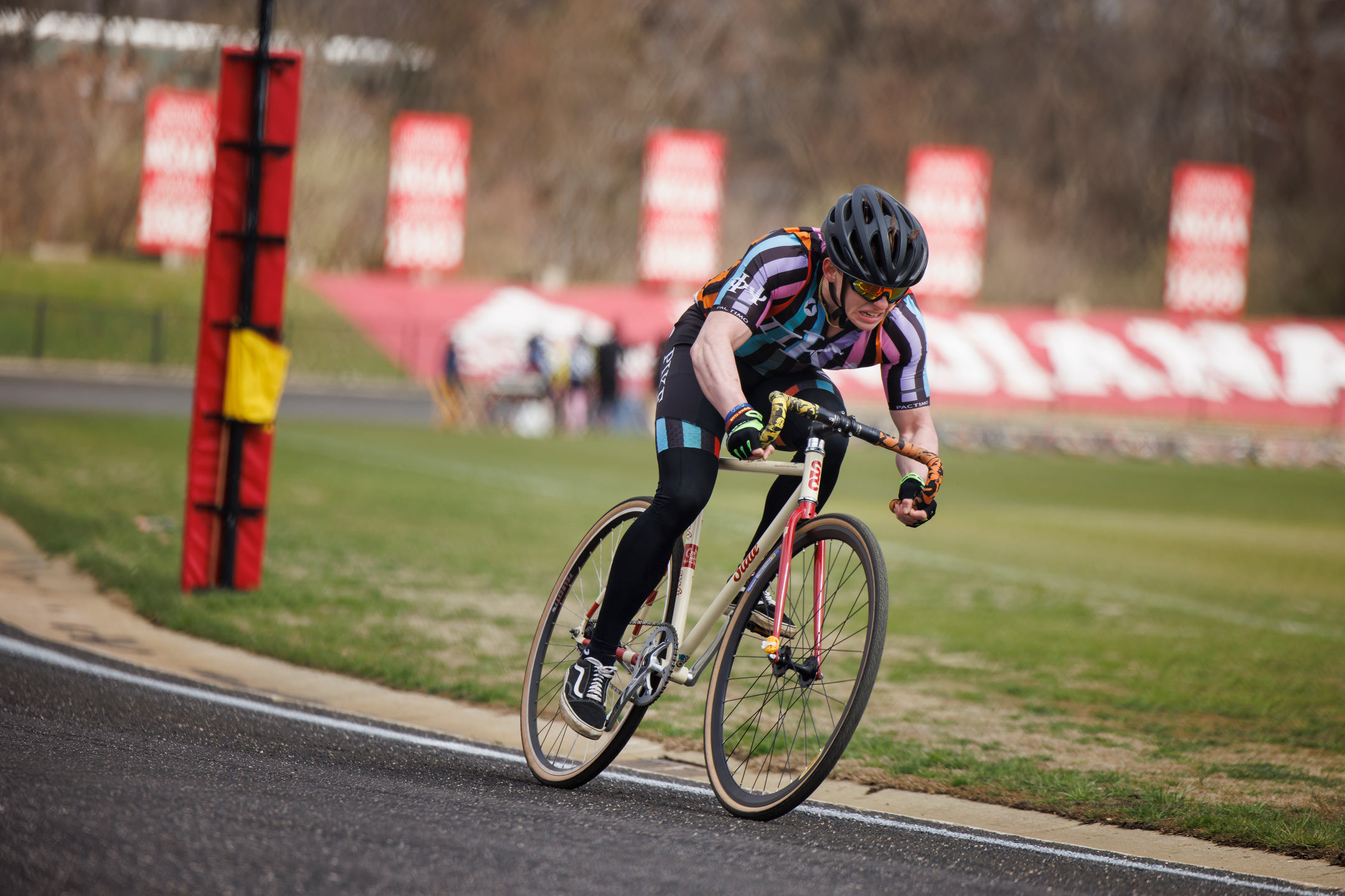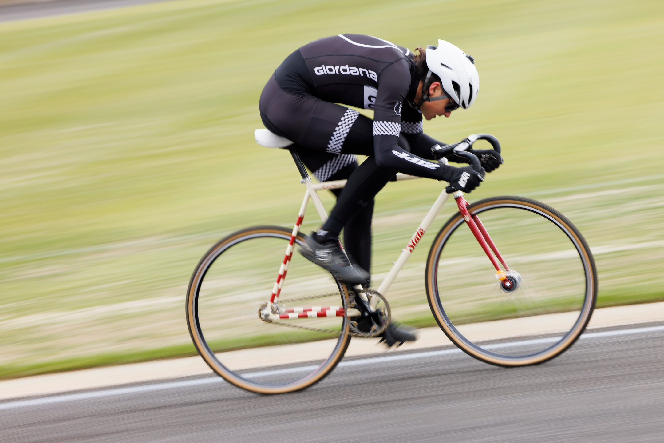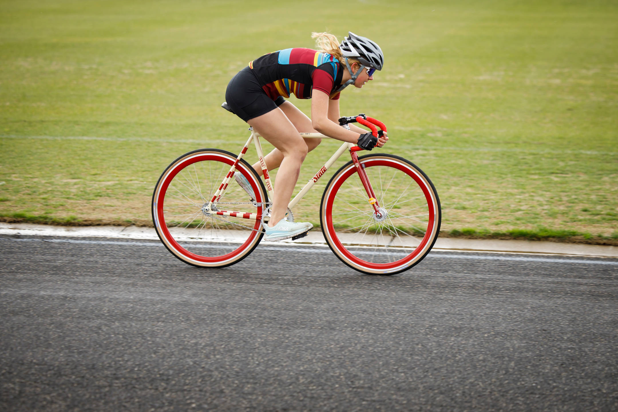 Kappa Alpha Theta rider Bailey Cappella rides down the front stretch during Little 500 Qualifications at Bill Armstrong Stadium on Saturday, March 25, 2023. (James Brosher/Indiana University)