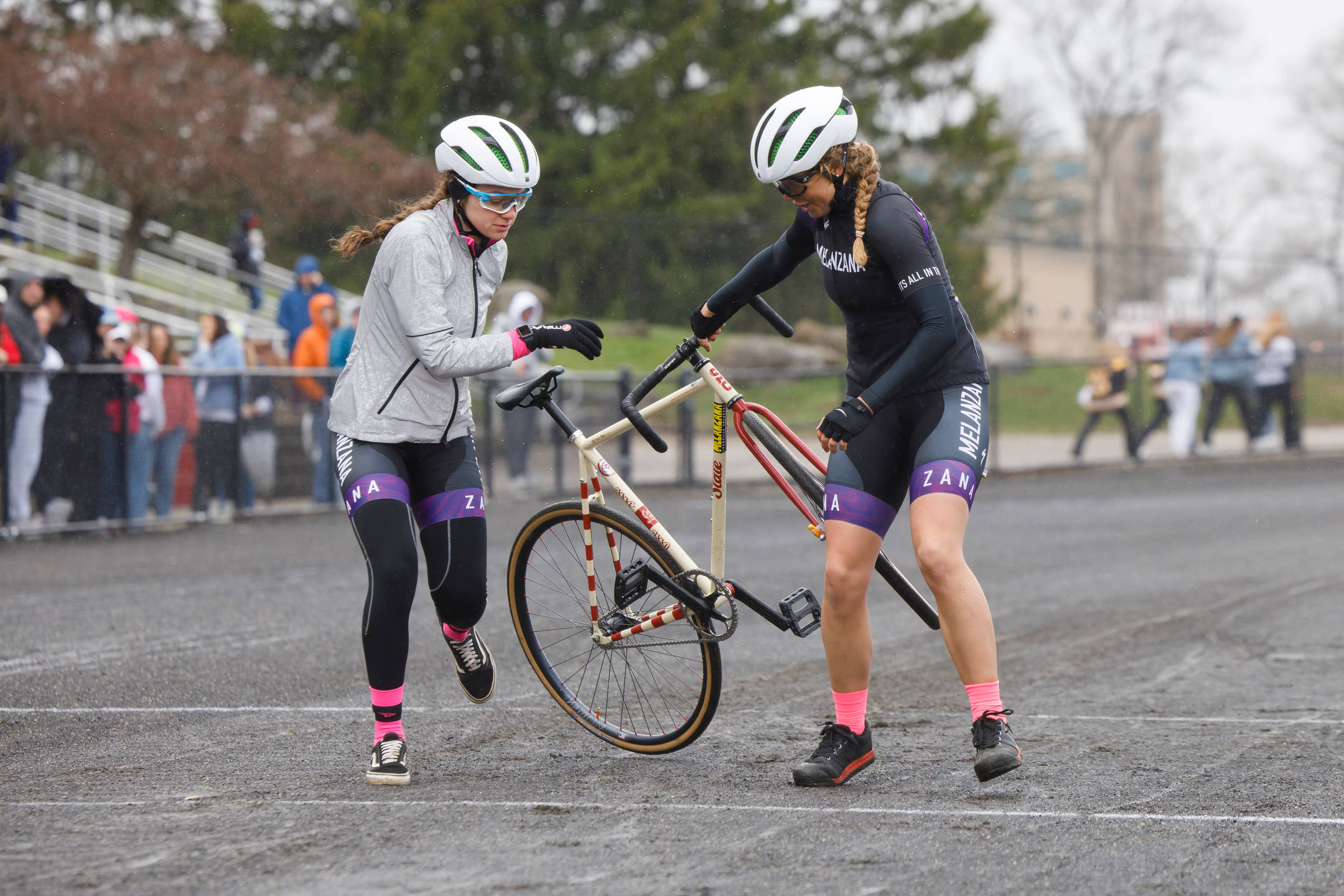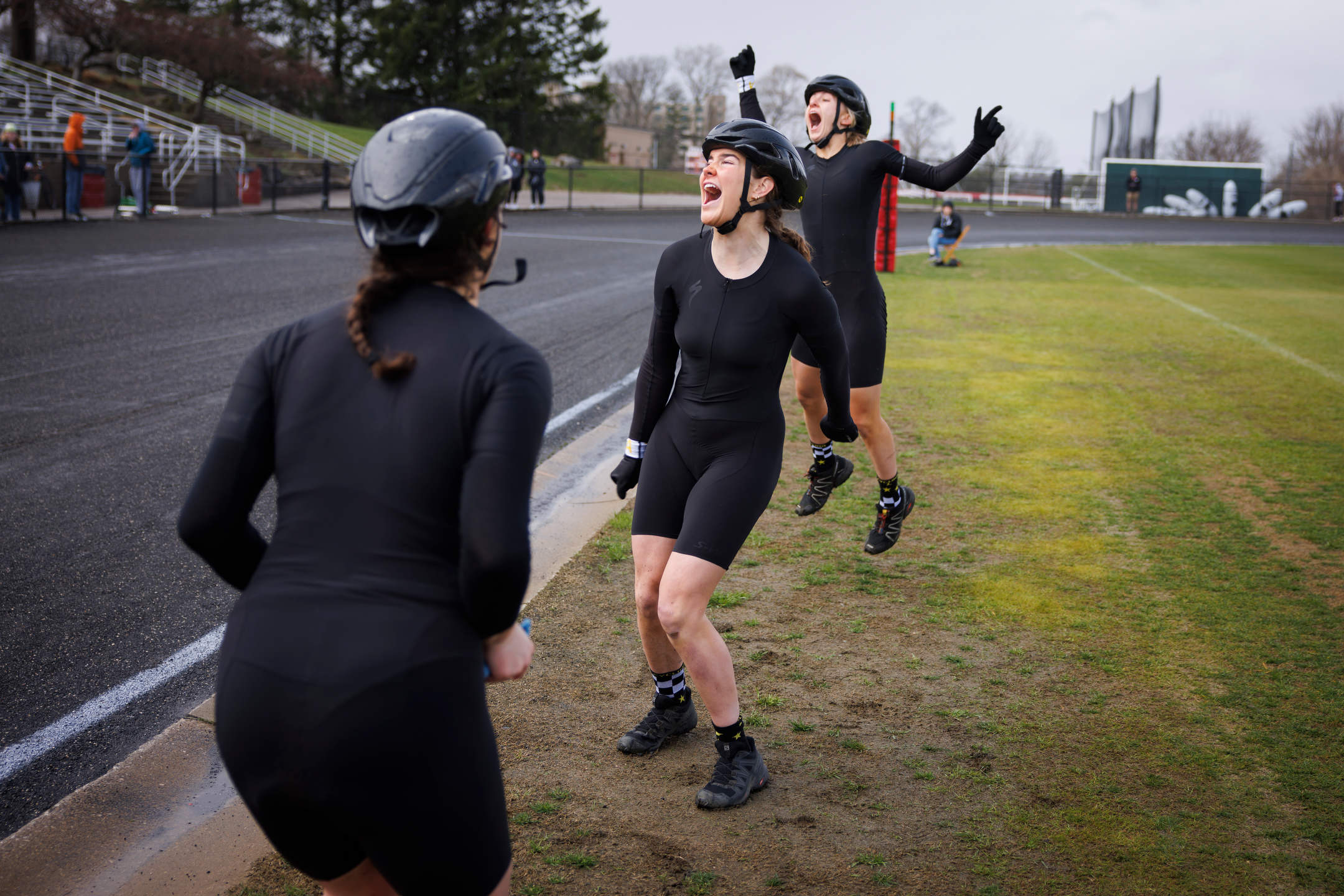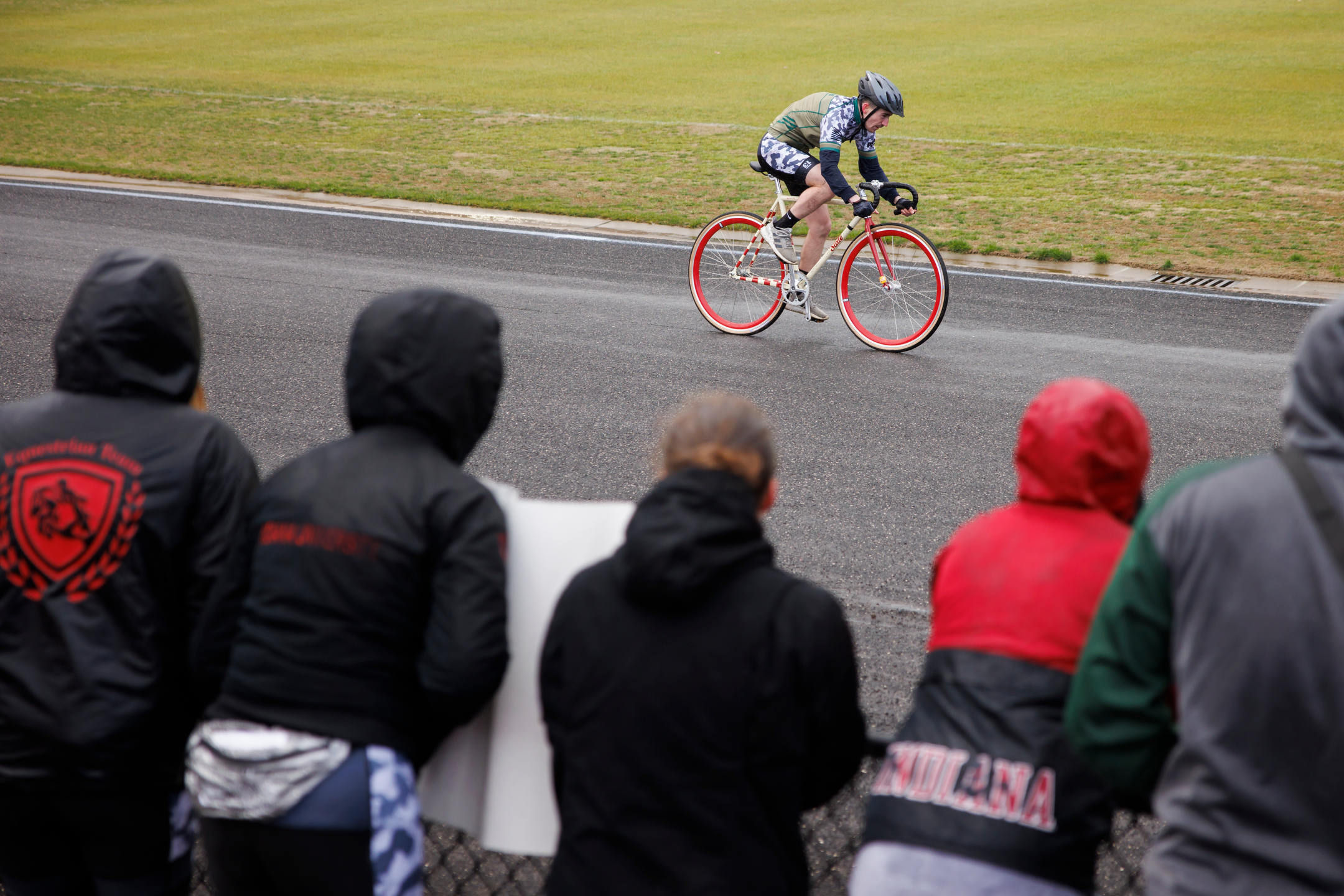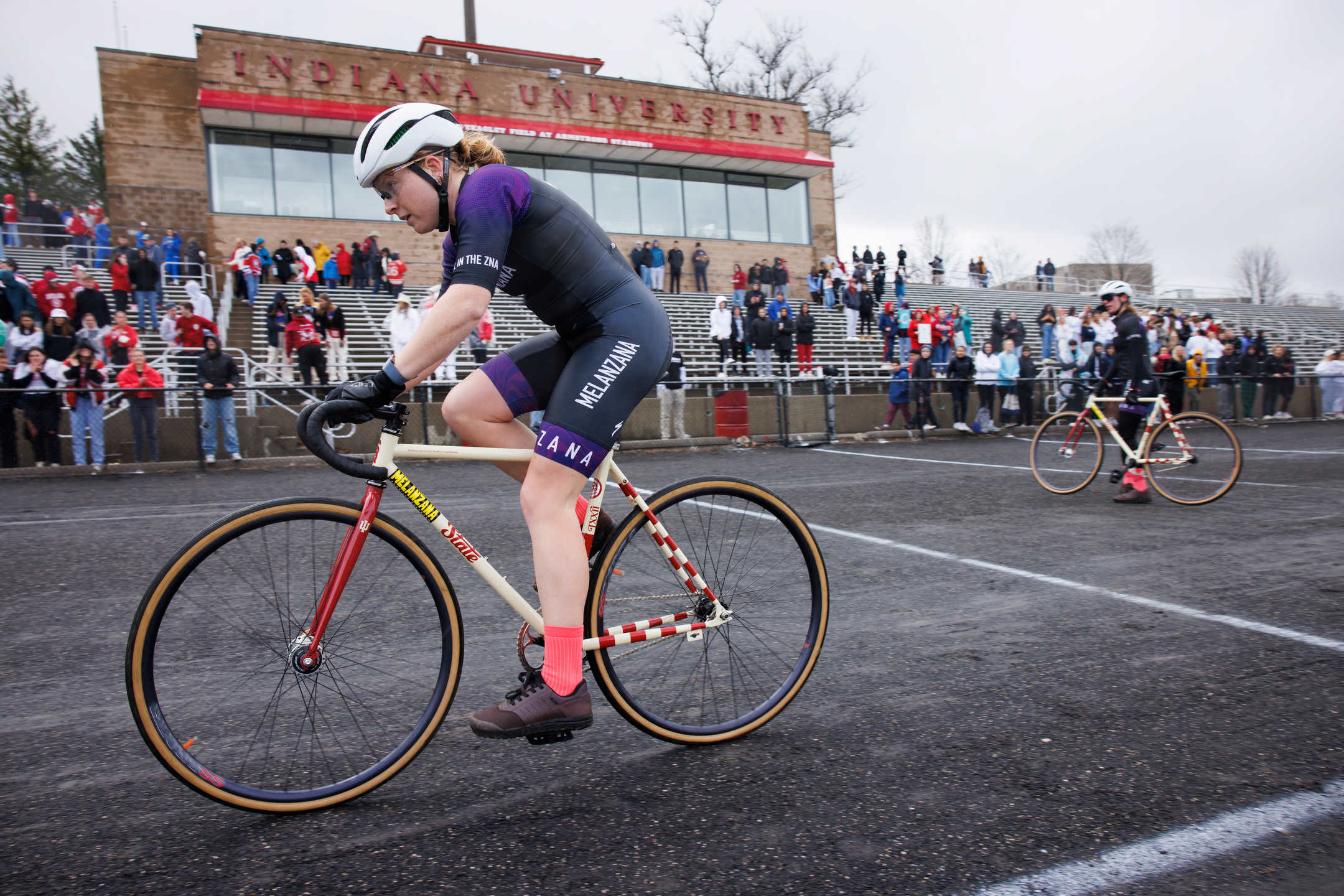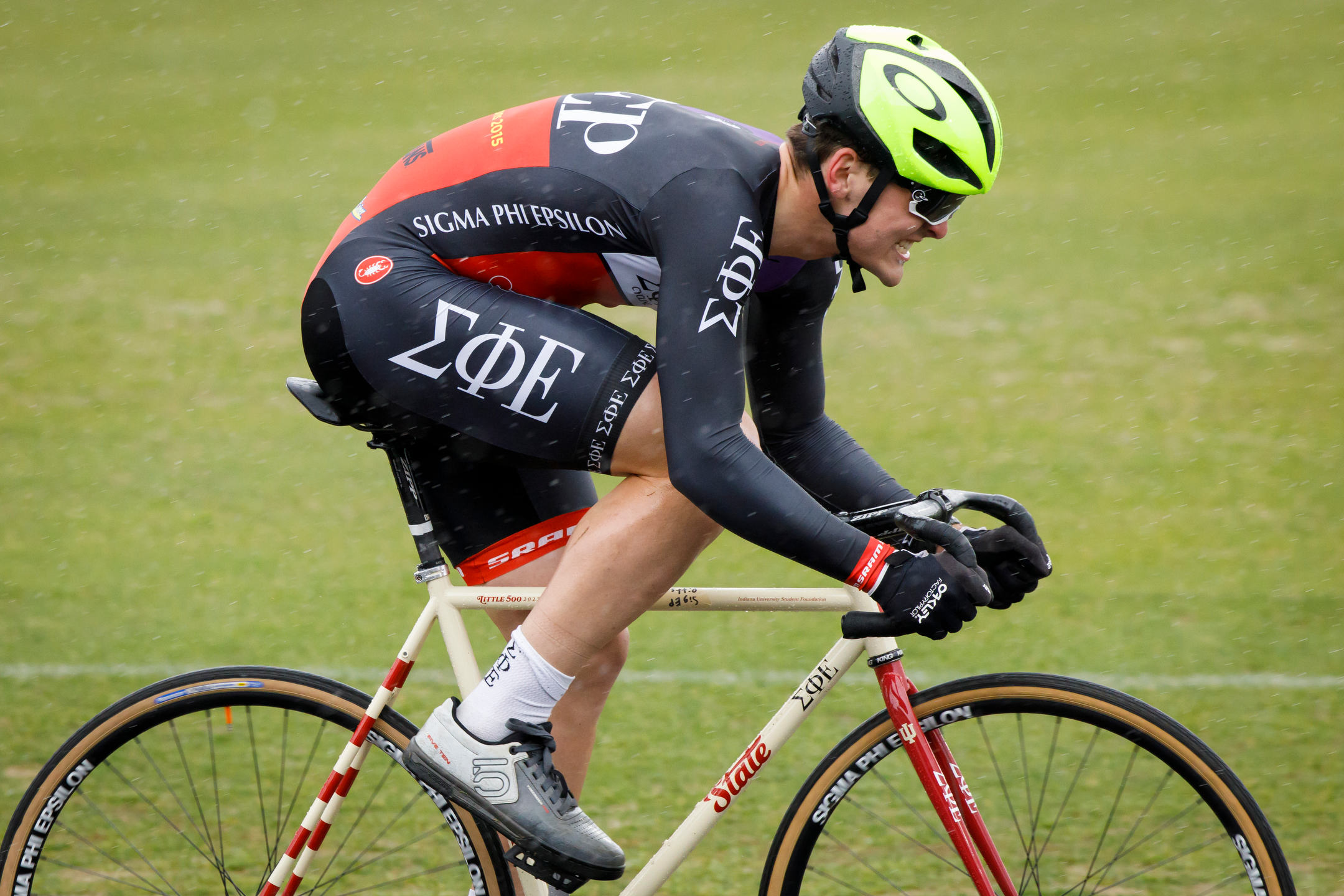 Kappa Alpha Theta riders Katie Humphries, left, Bailey Cappella and Audrey La Valle celebrate after qualifying for the Little 500 at Bill Armstrong Stadium on Saturday, March 25, 2023. (James Brosher/Indiana University)Cutters rider Peyton Gaskill rides the team’s final lap during Little 500 Qualifications at Bill Armstrong Stadium on Saturday, March 25, 2023. (James Brosher/Indiana University)Raindrops cling to a State Bicycle Co. Little 500 bicycle during qualifications at Bill Armstrong Stadium on Saturday, March 25, 2023. (James Brosher/Indiana University)Sigma Phi Epsilon rider Max Martin rides down the back stretch in the rain during Little 500 Qualifications at Bill Armstrong Stadium on Saturday, March 25, 2023. (James Brosher/Indiana University)Melanzana rider Grace Washburn rides down the front stretch after an exchange during Little 500 Qualifications at Bill Armstrong Stadium on Saturday, March 25, 2023. (James Brosher/Indiana University)Army rider Charlie Jacoba rides towards turn three during Little 500 Qualifications at Bill Armstrong Stadium on Saturday, March 25, 2023. (James Brosher/Indiana University)