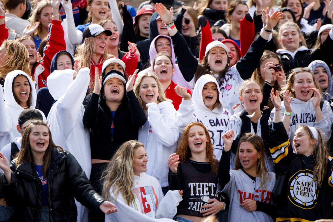 Kappa Alpha Theta fans cheer on their riders from the stands during Little 500 Qualifications at Bill Armstrong Stadium on Saturday, March 25, 2023. (James Brosher/Indiana University)