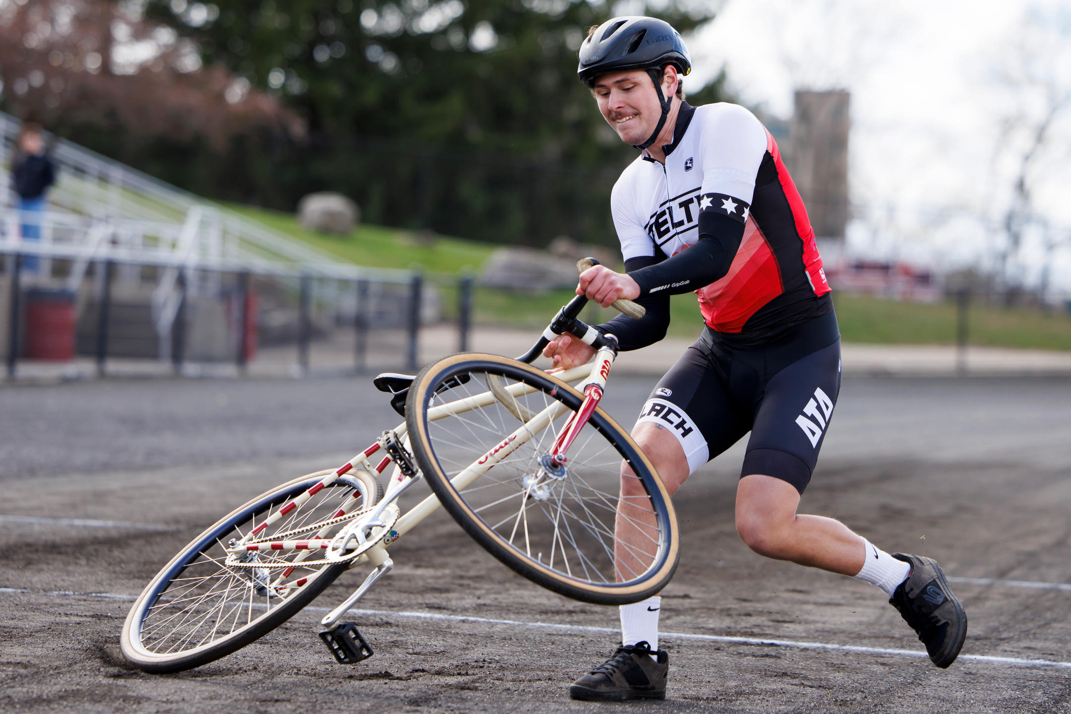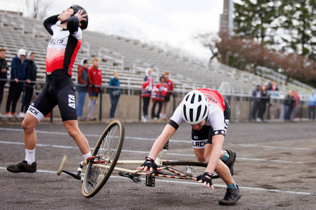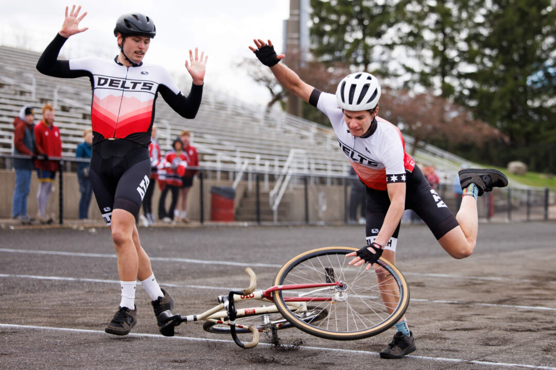 Delta Tau Delta rider Jon Petersen falls to the ground while making an exchange with teammate Brady Jarosinski, left, during Little 500 Qualifications at Bill Armstrong Stadium on Saturday, March 25, 2023. (James Brosher/Indiana University)