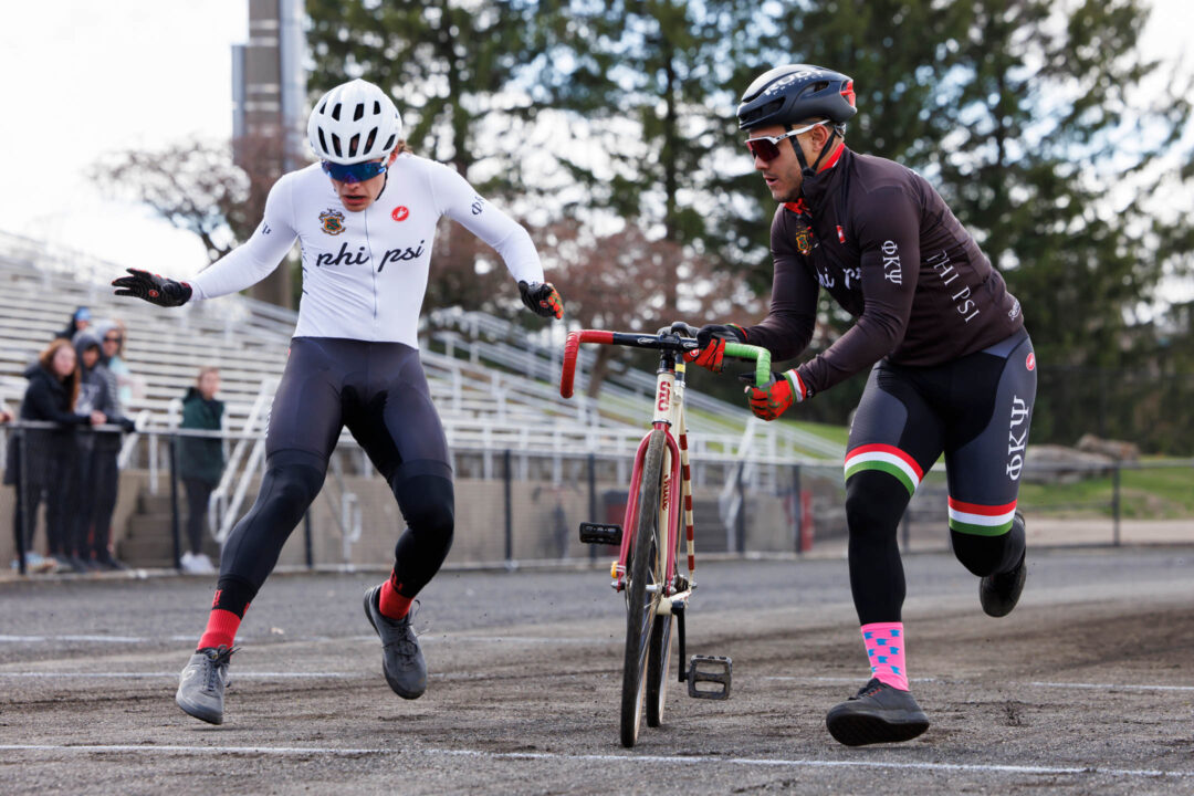 Phi Kappa Psi riders Albert Schafer, left, and Kaleb Cooper make an exchange during Little 500 Qualifications at Bill Armstrong Stadium on Saturday, March 25, 2023. (James Brosher/Indiana University)