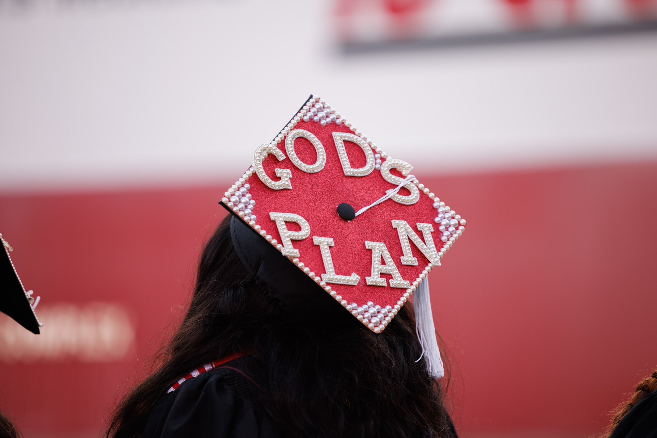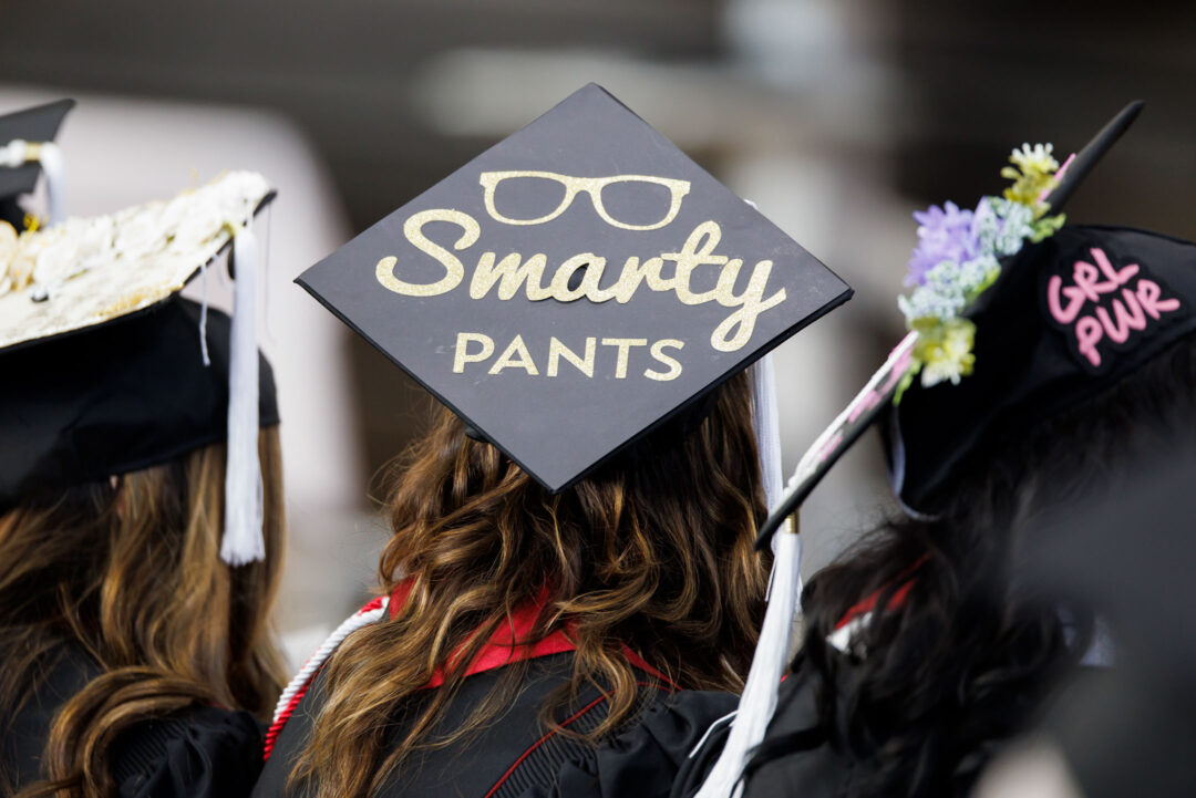A graduate wears a decorated cap during the IU Bloomington Graduate Commencement at Simon Skjodt Assembly Hall on Friday, May 9, 2025. (Photo by James Brosher/Indiana University)