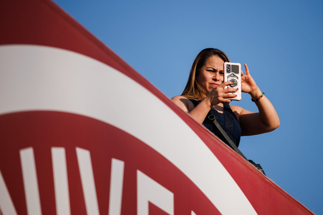 A graduate smiles as she locates a familiar face in the crowd during the IU Bloomington Undergraduate Commencement at Memorial Stadium on Saturday, May 10, 2025. (Photo by James Brosher/Indiana University)