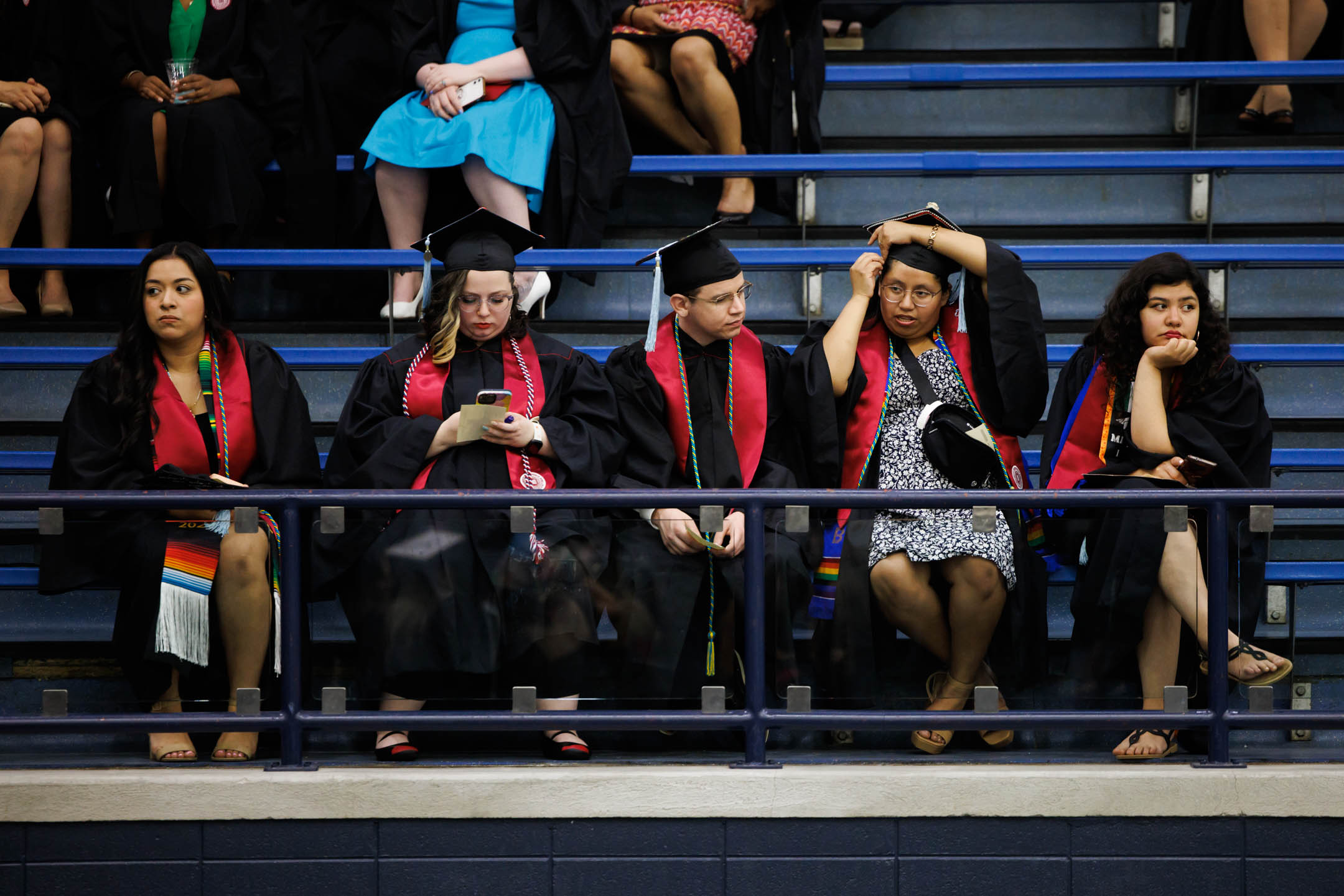 Graduates wait for the start of the IU Bloomington Graduate Commencement in Wilkinson Hall on Friday, May 9, 2025. (Photo by James Brosher/Indiana University)