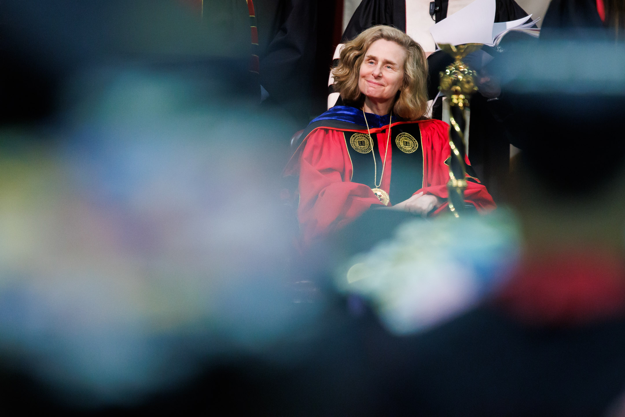 Graduates listen to a speaker during the IU Bloomington Graduate Commencement at Simon Skjodt Assembly Hall on Friday, May 9, 2025. (Photo by James Brosher/Indiana University)