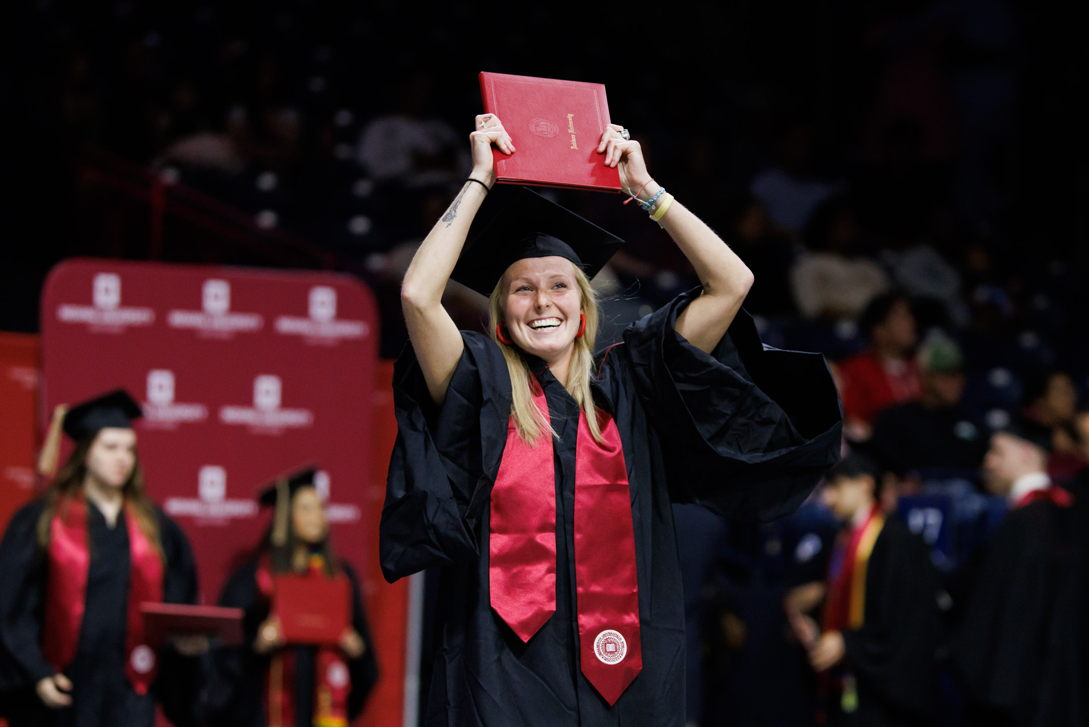 A graduate poses for friends and family the audience during the IU Bloomington Graduate Commencement at Simon Skjodt Assembly Hall on Friday, May 9, 2025. (Photo by James Brosher/Indiana University)
