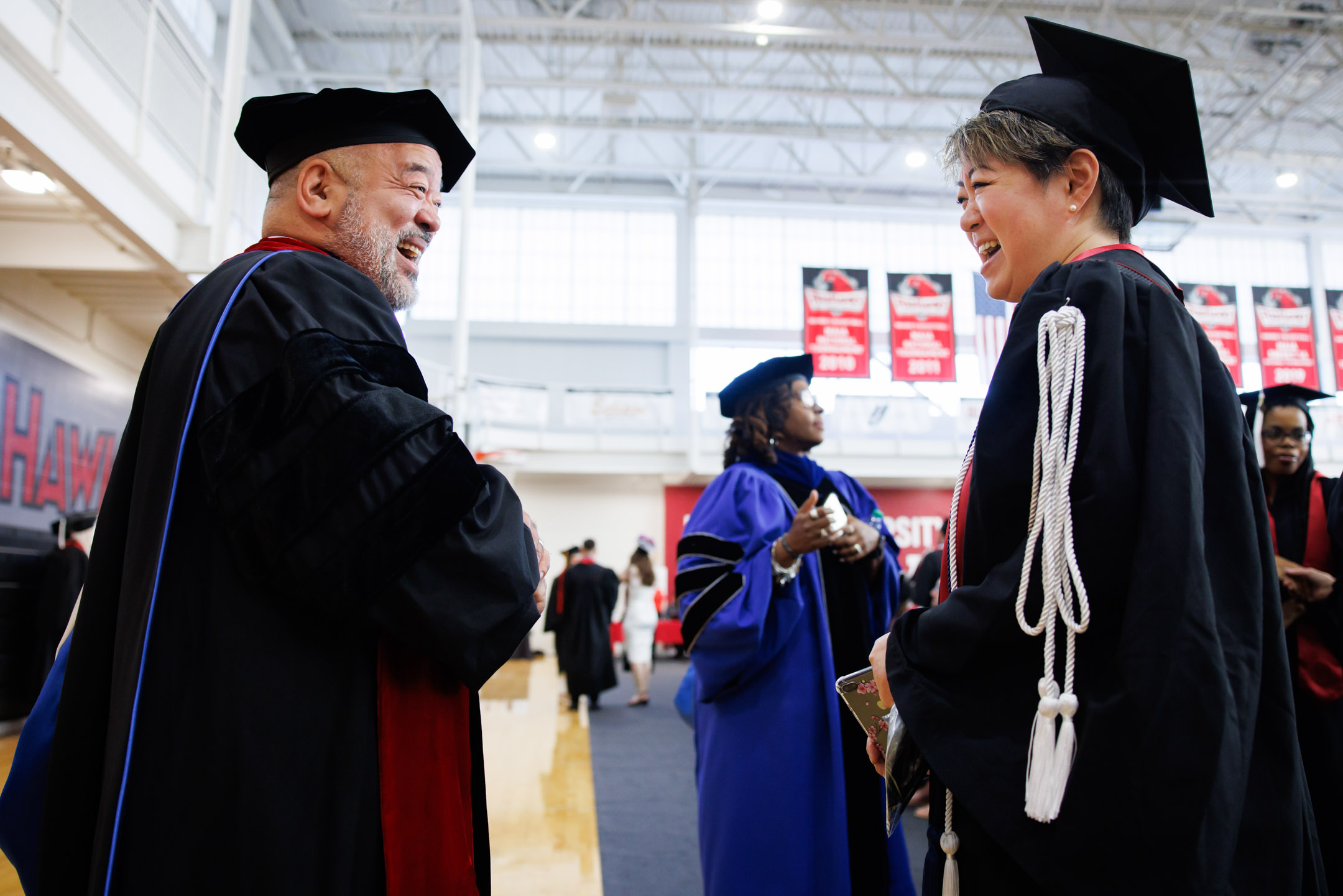 Graduates wait in line to have their photos taken before the Indiana University Indianapolis Commencement in the Natatorium on Thursday, May 15, 2025. (Photo by James Brosher/Indiana University)